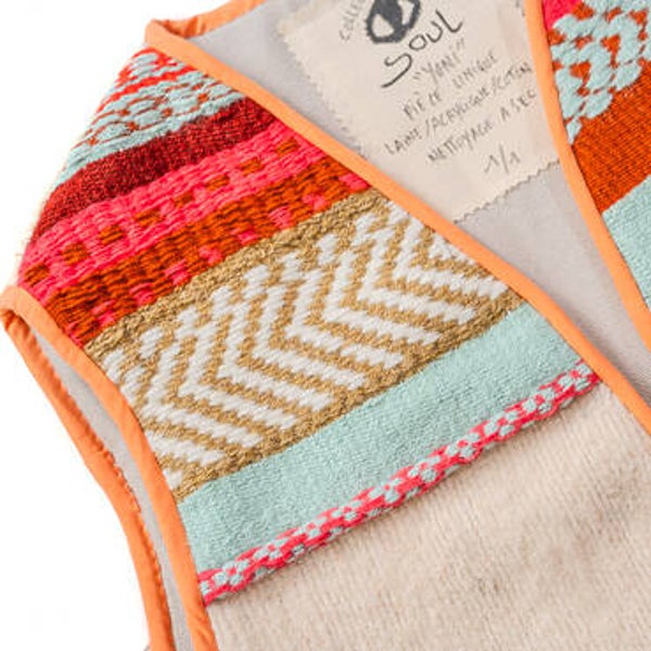 Entièrement réalisé et tissé à la main sur métier, il est composé de pure laine, laine synthétique et coton. Intérieur doublé de toile coton pour plus de douceur.