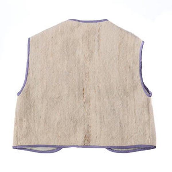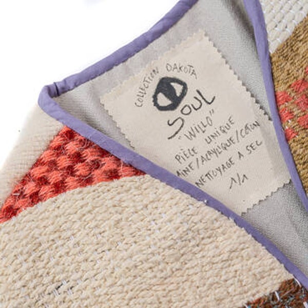 Entièrement réalisé et tissé à la main sur métier, il est composé de pure laine, laine synthétique et coton. Intérieur doublé de toile coton pour plus de douceur.
