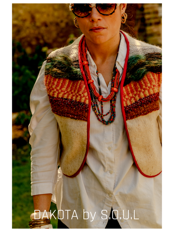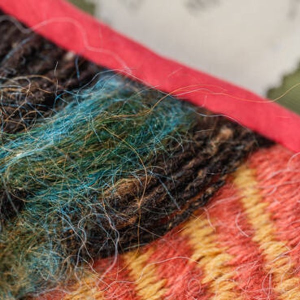Entièrement réalisé et tissé à la main sur métier, il est composé de pure laine, laine synthétique et coton. Intérieur doublé de toile coton pour plus de douceur.