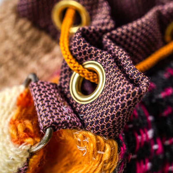 Entièrement réalisé et tissé à la main sur métier, il est composé de pure laine, laine synthétique et coton. Intérieur doublé de toile coton pour plus de douceur.