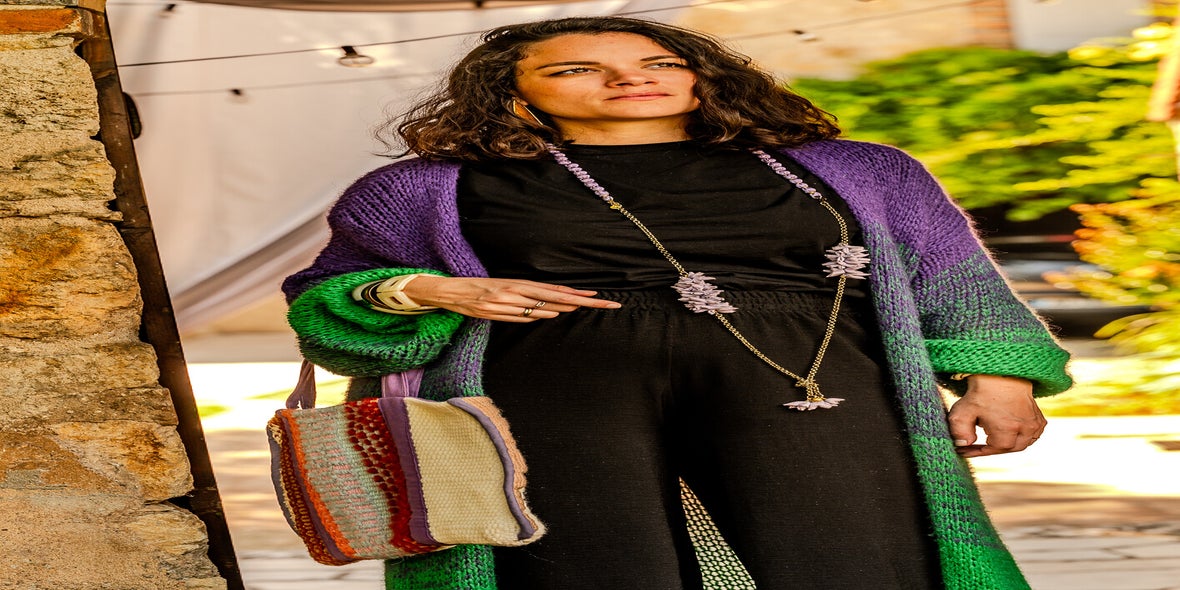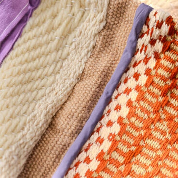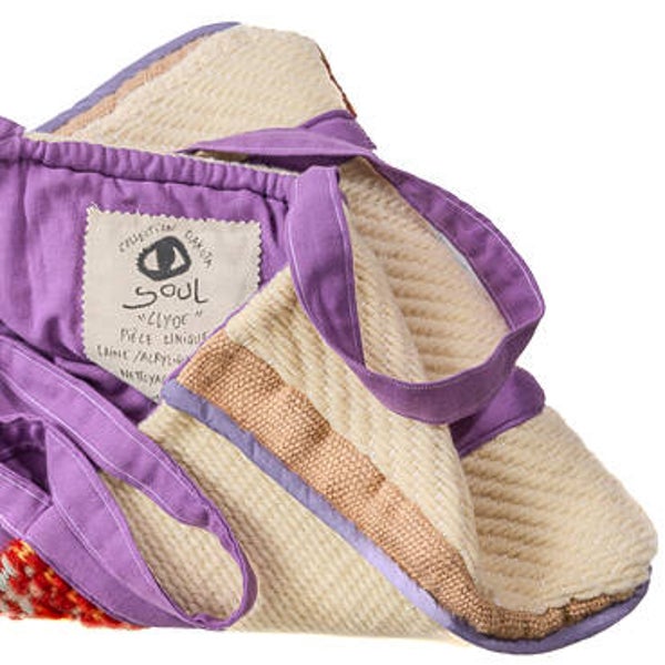 Entièrement réalisé et tissé à la main sur métier, il est composé de pure laine, laine synthétique et coton. Intérieur doublé de toile coton pour plus de douceur.