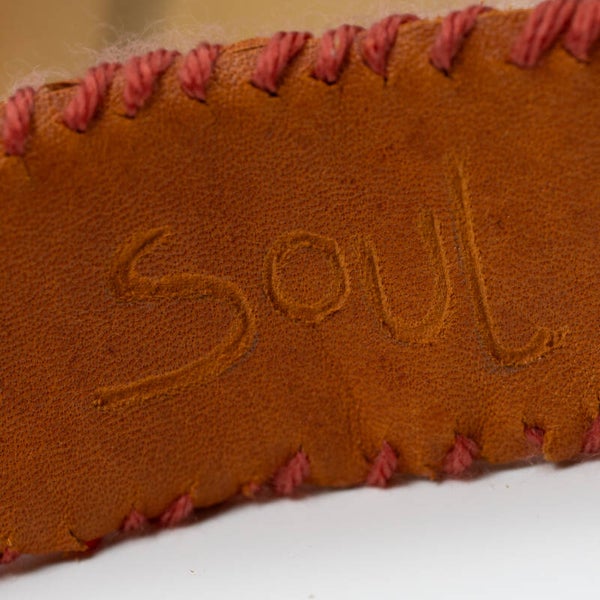 Ceinture crochetée à la main et doublée de cuir vachette caramel.