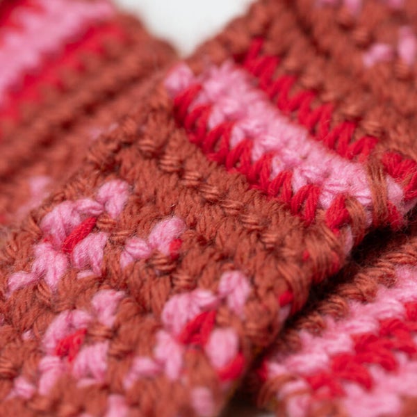 Ceinture crochetée à la main et doublée de cuir vachette caramel.