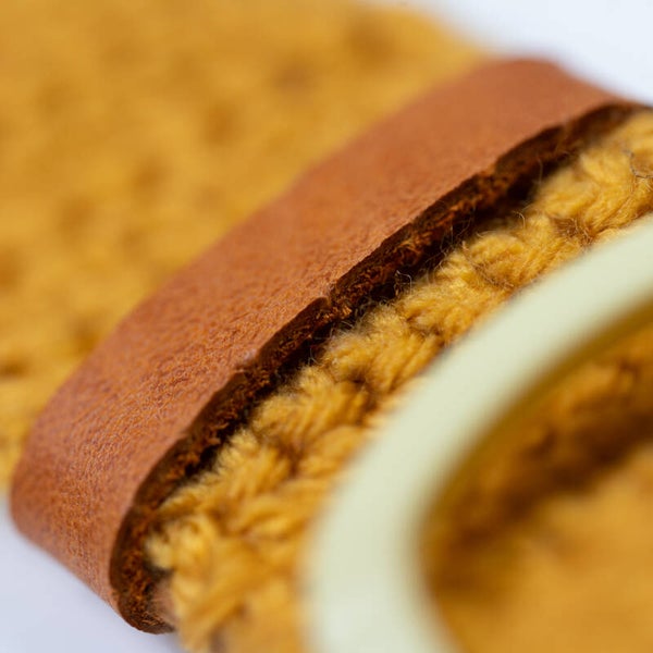 Ceinture crochetée à la main et doublée de cuir vachette caramel.
