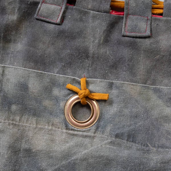 Une poche appliquée sur une face du sac et fermé par un lien cousu.